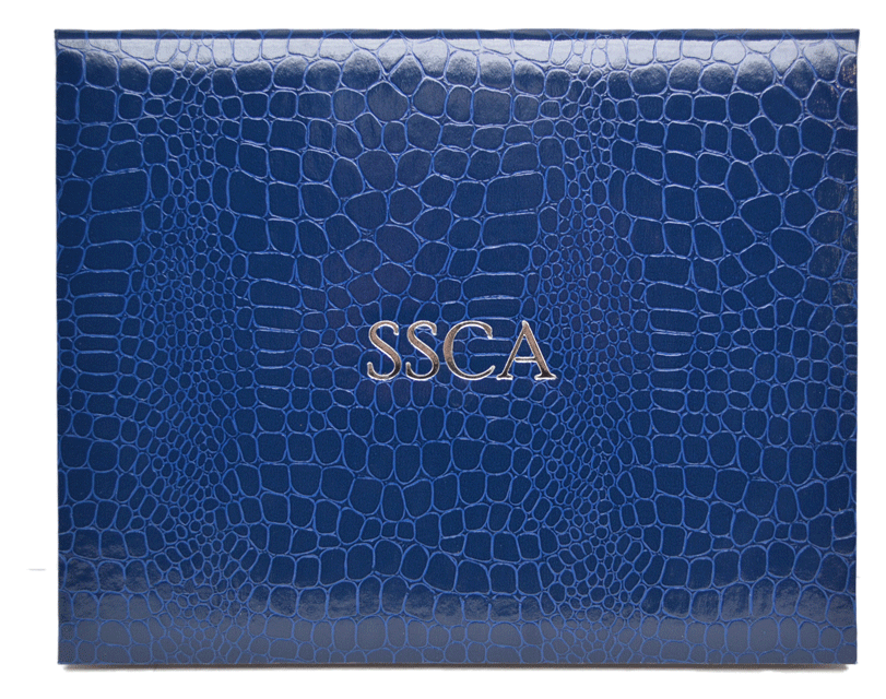 - Glossy alligator-textured leatherette cover material with padding and turned edges